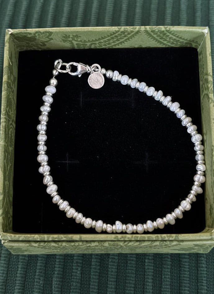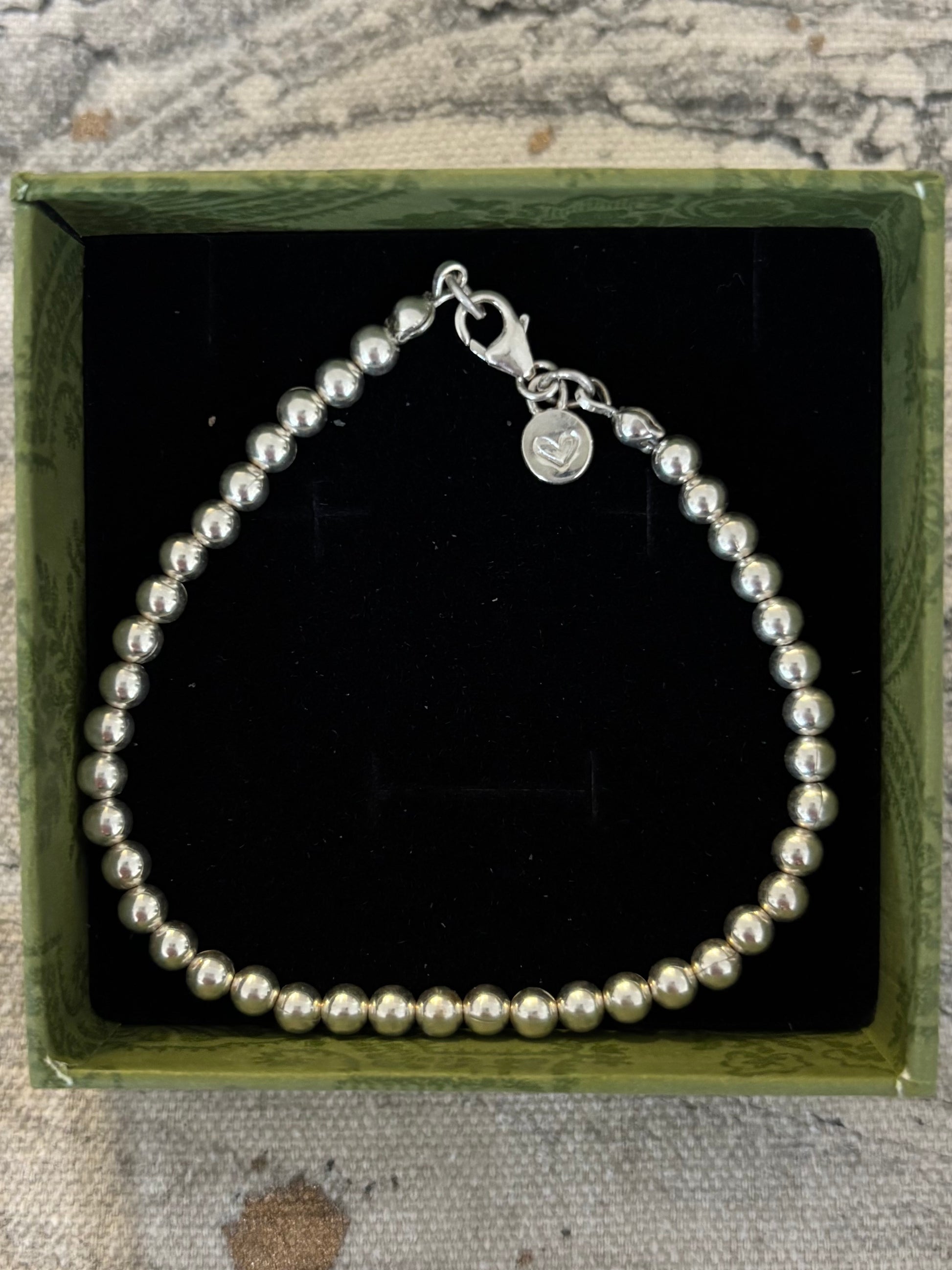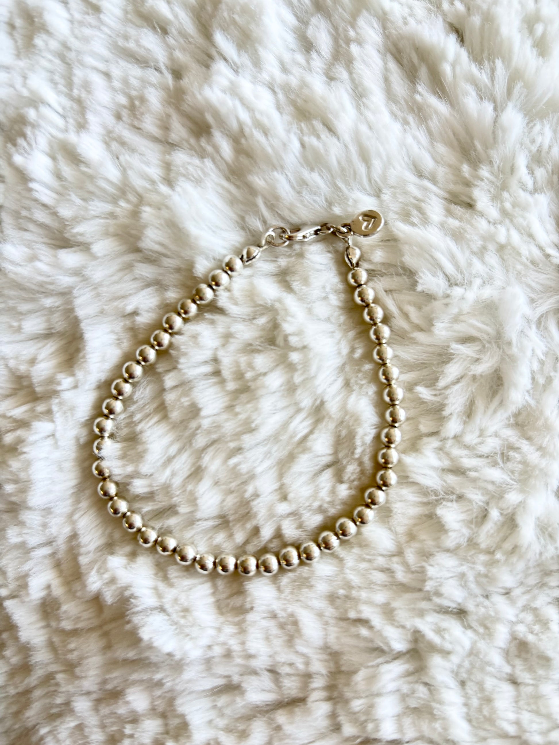 The most elegant silver beaded bracelet for your collection made with 4mm solid silver beads strung on jewellery wire. A silver lobster clasp is used for keeping it securely on the wrist and we've added a 925 silver tag. Perfect for layering with your solid silver bangles.