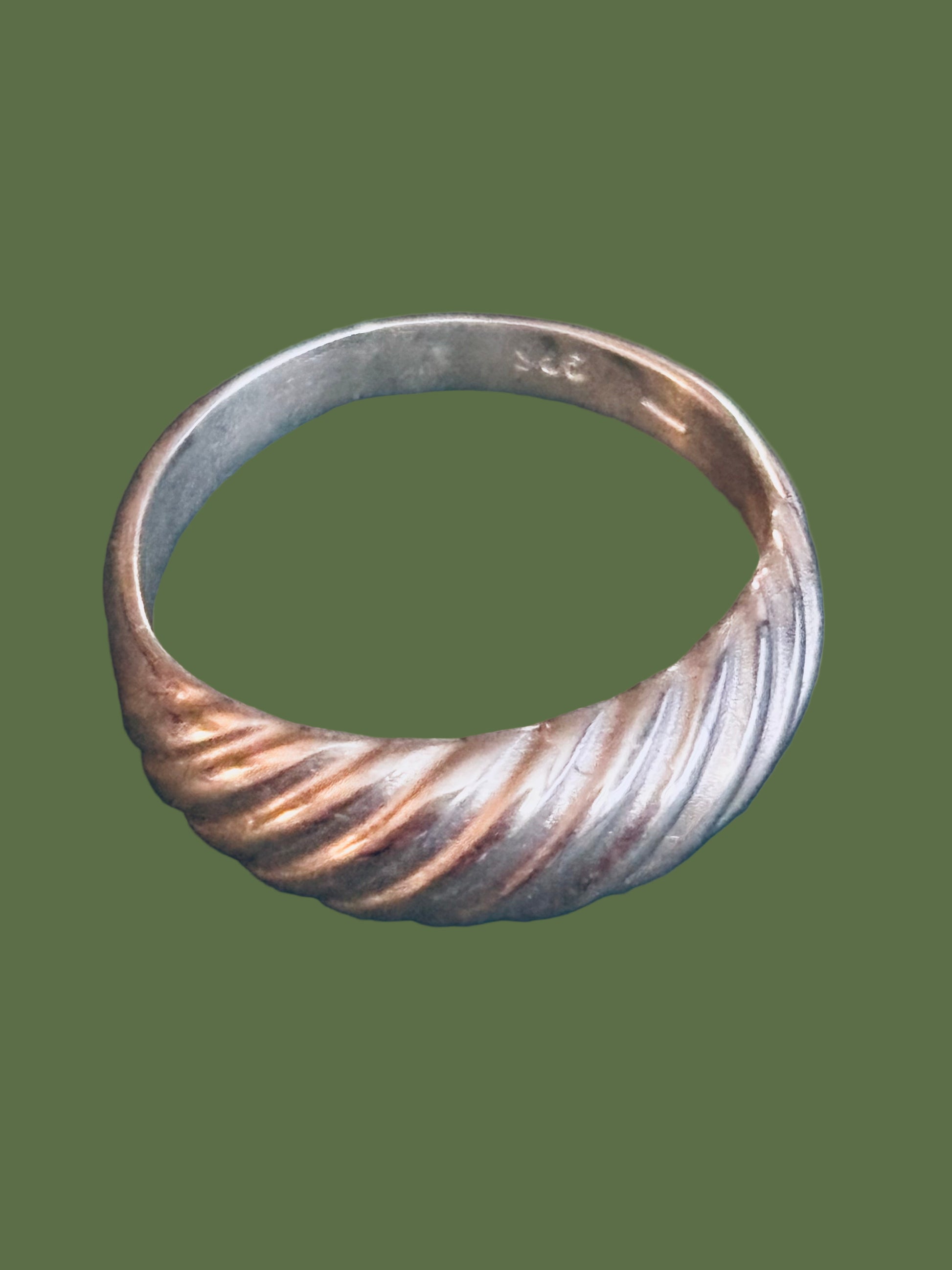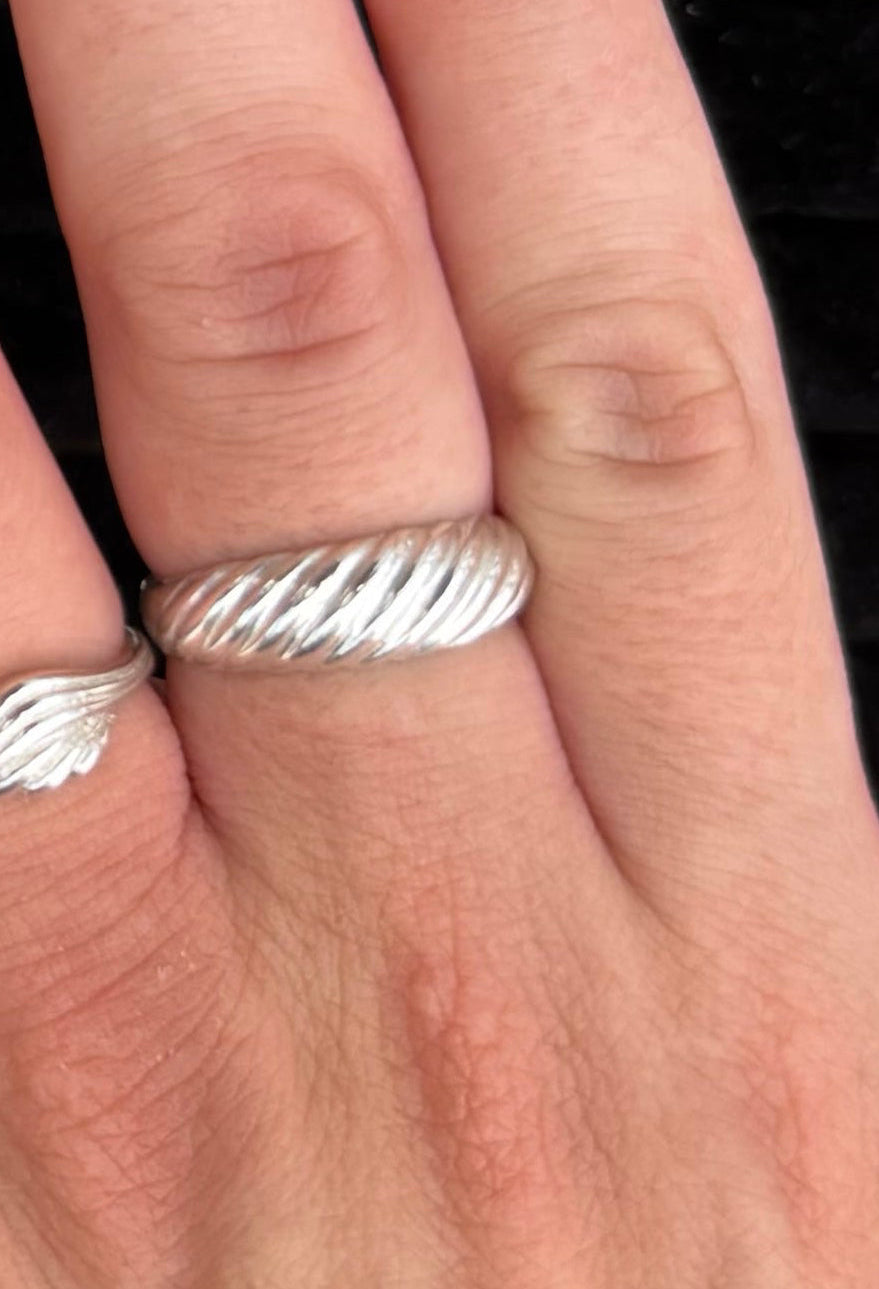 The Serra Ring features gentle ridges across the top of the band, adding movement and dimension while keeping a refined, minimalist feel. Cast in solid sterling silver, it’s a comfortable everyday piece with a touch of sculptural detail.