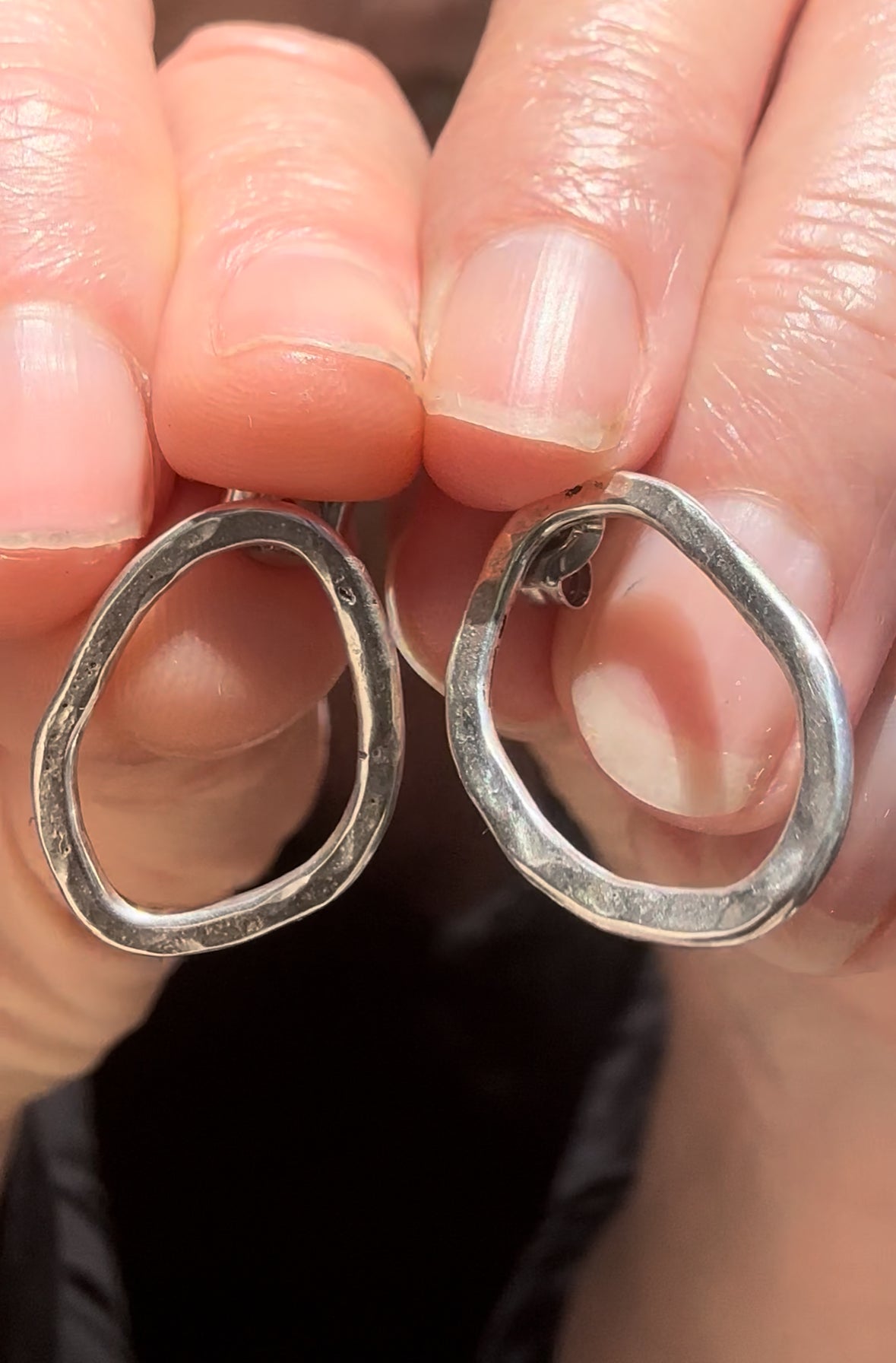 Each pair is handcrafted from solid 925 sterling silver and finished with a soft hammered texture that catches the light beautifully. The back post is centred at the top, with the bottom of the ovsl hanging just below the lobe for a hint of movement.